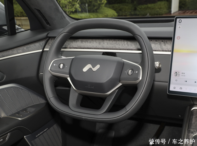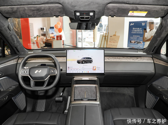 在车内,乐道L90采用了环抱式的座舱设计,中控台线条非常简洁,中间硕大的17.2英寸悬浮式中控屏很是醒目,分辨率达到了惊人的3K。同时,它的后排还有8英寸的液晶屏和17.3英寸的3K分辨率吸顶式娱乐屏,简直是把家里的彩电搬到了汽车里。车内的座椅和方向盘都是真皮材质,手感相当细腻,车内的饰板还大量使用了实木材质,营造出了不错的豪华氛围。