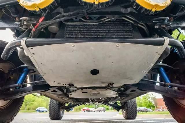 车体方面,切割了前包围,以增加接近角,增加Zerek Fabrication定制防撞杠与下护板,还在护杠上增加了7个LED探照灯,这些都是越野改装常见的装备。而标志性的跳灯还保留着,这种搭配真的很新鲜很吸睛。