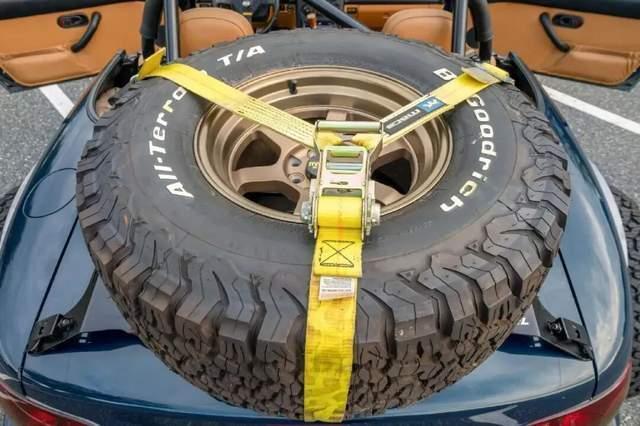 车内增加了Track Dog Racing的Hard Dog防滚架,不仅起到强化车身的作用,当越野侧翻时更能保护车内乘员,这对于敞篷越野车来说非常有必要。而为了拓展装载能力,在后备箱上增加了金属支架,放置全尺寸备胎。