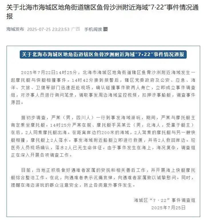 7月25日23时23分,广西北海市海城区发布了一则情况通报,称2025年7月22日14时25分,北海市海城区地角街道辖区鱼骨沙洲附近海域发生一起摩托艇与快艇相撞事件。据初步调查,严某(男,四川人)一行到事发海域游玩,其间,严某与摩托艇主商定乘坐摩托艇。14时25分严某在前、摩托艇手吴某云(男,北海人,受雇于艇主)在后,2人同乘摩托艇出海。在距离岸边约200米的海域,2人驾乘的摩托艇与另一艘快艇相撞,摩托艇上2人落水。事发海域附近船艇立即进行救援,并将2人救回岸边。经医务人员现场确认,落水2人已无生命体征。由于事件发生在海上,海况复杂,调查组正在深入开展各项调查工作。目前,当地正积极做好遇难者家属的安抚和相关善后工作,并开展海上快艇、摩托艇综合整治工作。在此通配资,向遇难者表示沉痛哀悼,向遇难者家属致以诚挚慰问。同时,提醒在海边游玩的群众注意安全,防止各类意外事件发生。